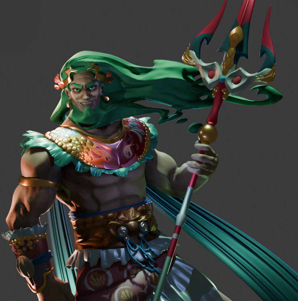 I've also been practicing some 3D modeling. To the left is a sculpt of Poseidon from Supergiant Games' Hades II. I'm also working on 3D assets for a fighting game I'm developing with some colleagues.