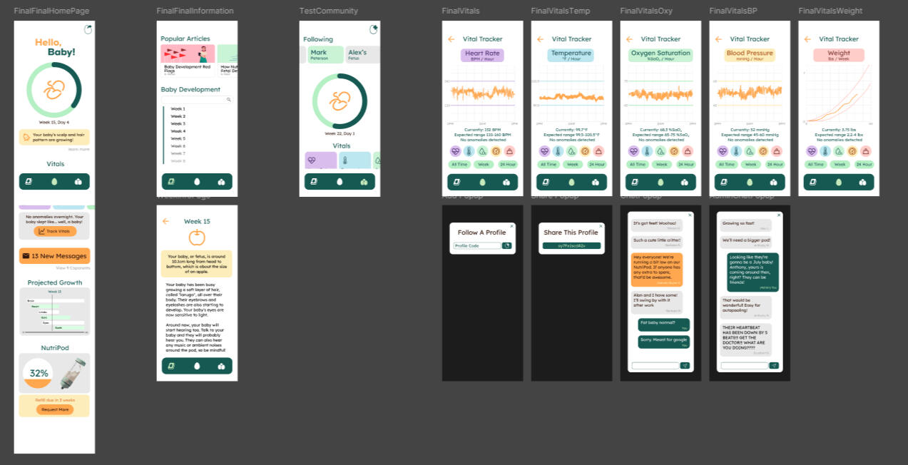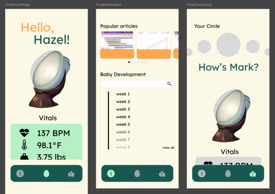 Our initial pitch focused on three core flows - a vitals tracker embedded within the incubator, an information page tracking the detail of each week of gestation, and a social feature to explore the dystopian effects of increased coparenting surveillance. "It takes a village to raise a child" and all.The abundance of egg motifs was especially on the nose for an incubator, but we felt that the concept of an egg didn’t necessarily feel feminine more so than it felt “baby”. Thus we decided to model the physical pod and our navigation icons around eggs, and introduced a yellowish orange that complimented our green as a sort of yolk color. These aesthetic choices allowed us to stay rather gender neutral while still evoking traditional parental, nurturing vibes.